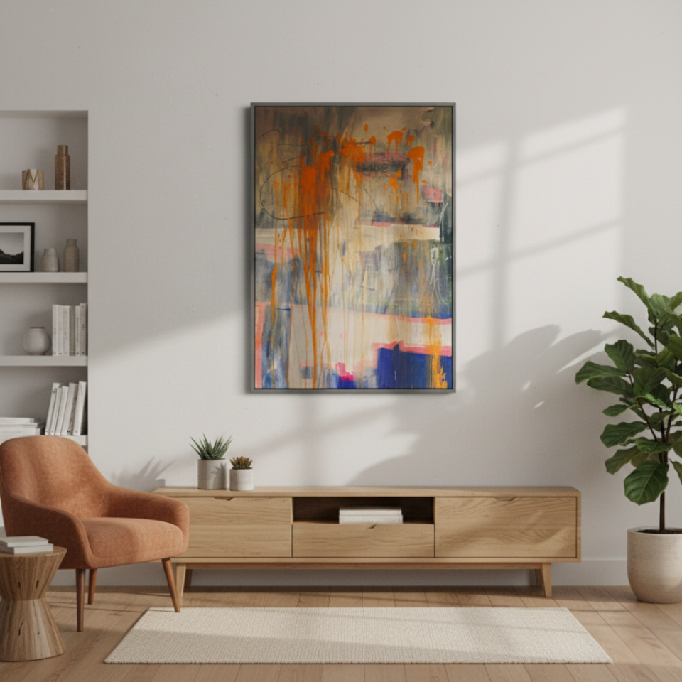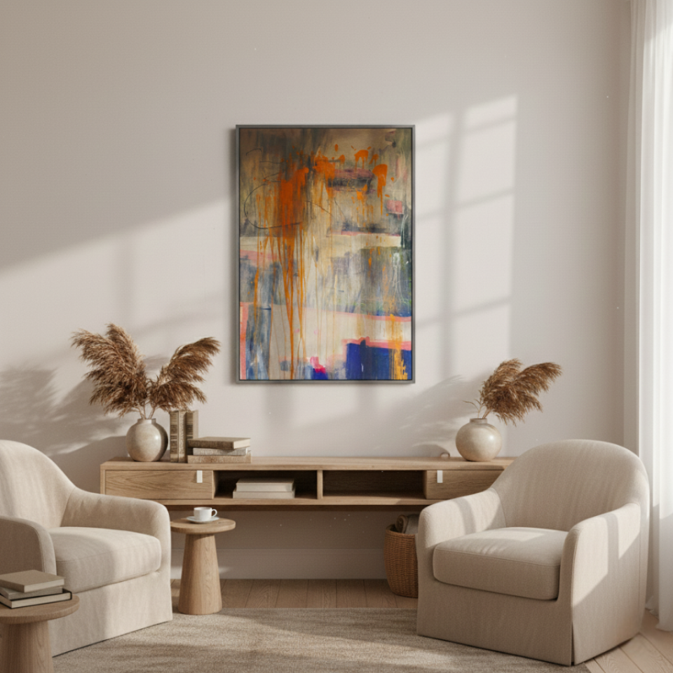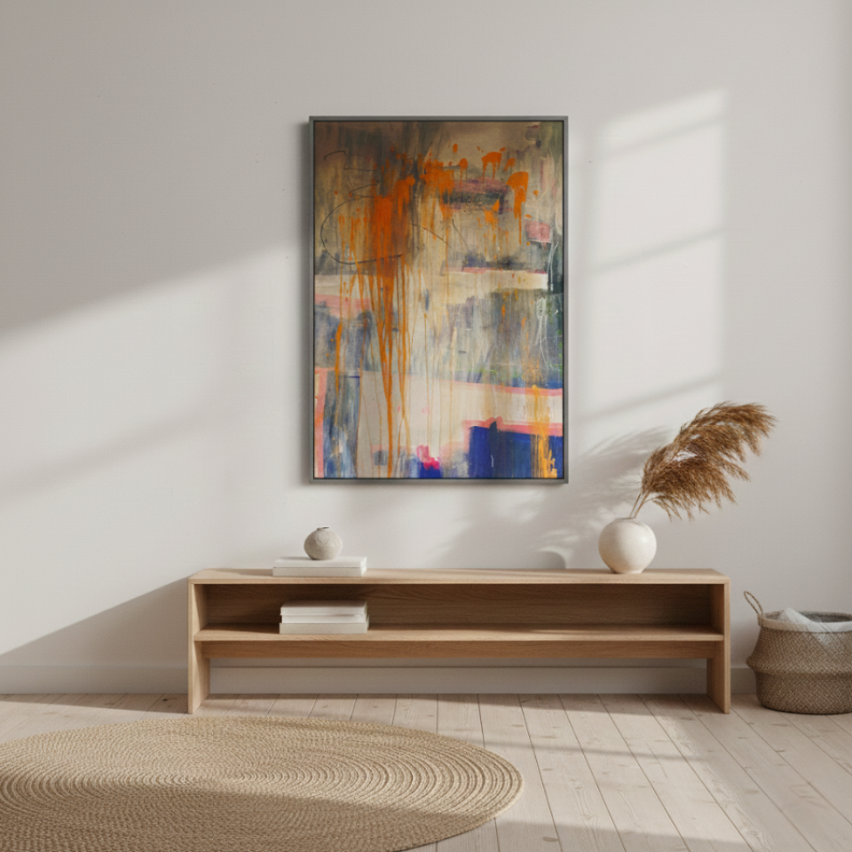 At the center of the series is “Orange Country,” a work that stands out with its warm oranges and soft pinks. The drips of paint running down the canvas give the piece a sense of movement and flow, as if the colors themselves are slowly melting into one another. The painting evokes the feeling of a warm sunset over a quiet landscape, with its soft color palette providing a sense of comfort and nostalgia. “Orange Country” is a celebration of warmth and subtle beauty, capturing the essence of fleeting moments in time.