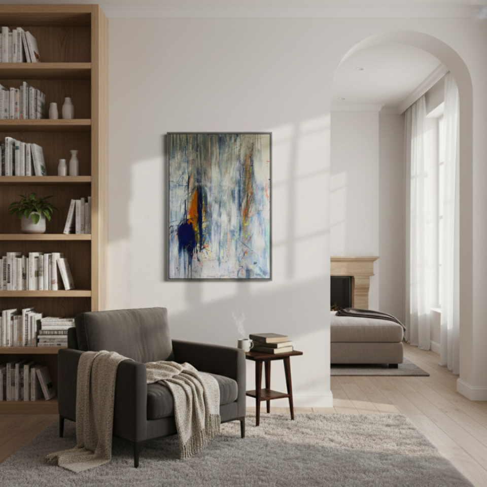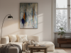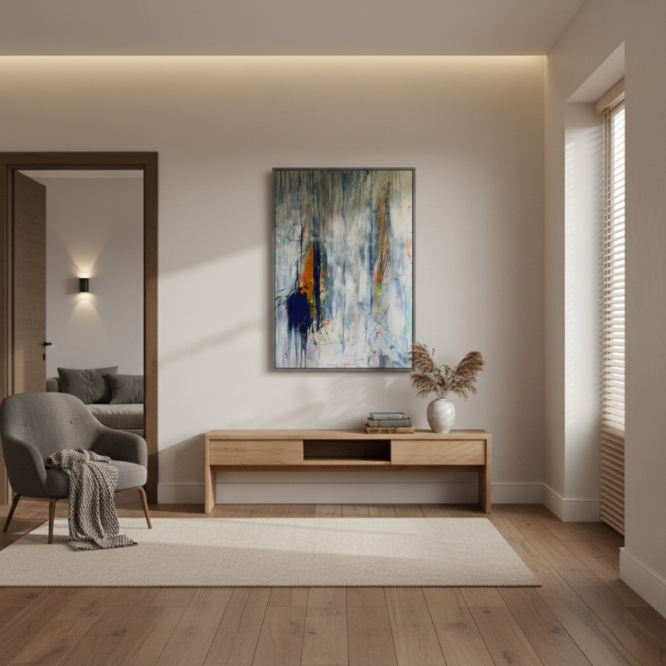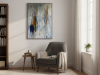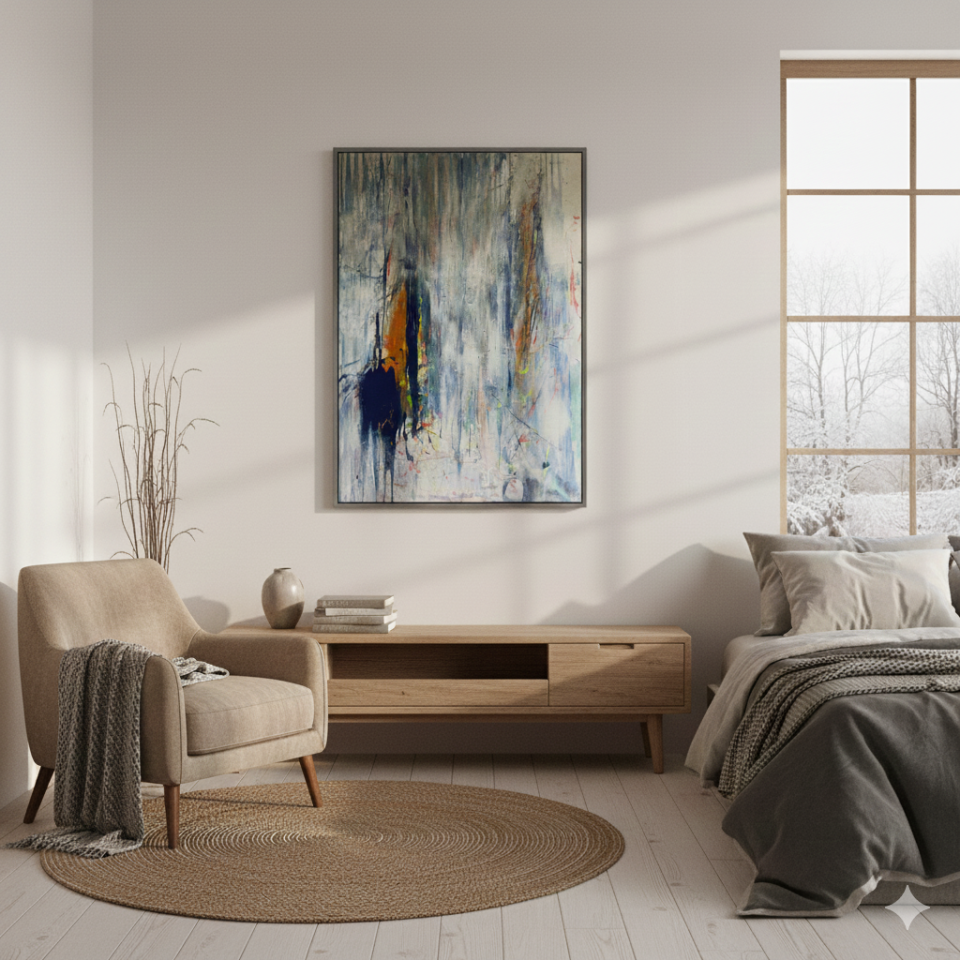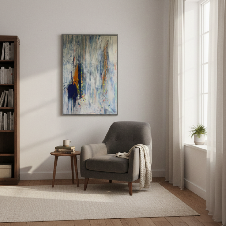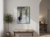 The first piece of the “Series Pastel”, “Frozen Sky”, sets the tone for the series with its cool, icy blues and soft grays, interrupted only by a single bold streak of bright yellow. The layering of paint creates an ethereal, cloud-like effect, as though the viewer is looking up at a sky on the verge of a winter storm. The painting conveys a feeling of quiet isolation, with the sharpness of the yellow acting as a reminder of warmth, distant but present. “Frozen Sky” invites the viewer to pause and reflect on the beauty found in cold, quiet spaces.