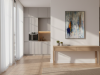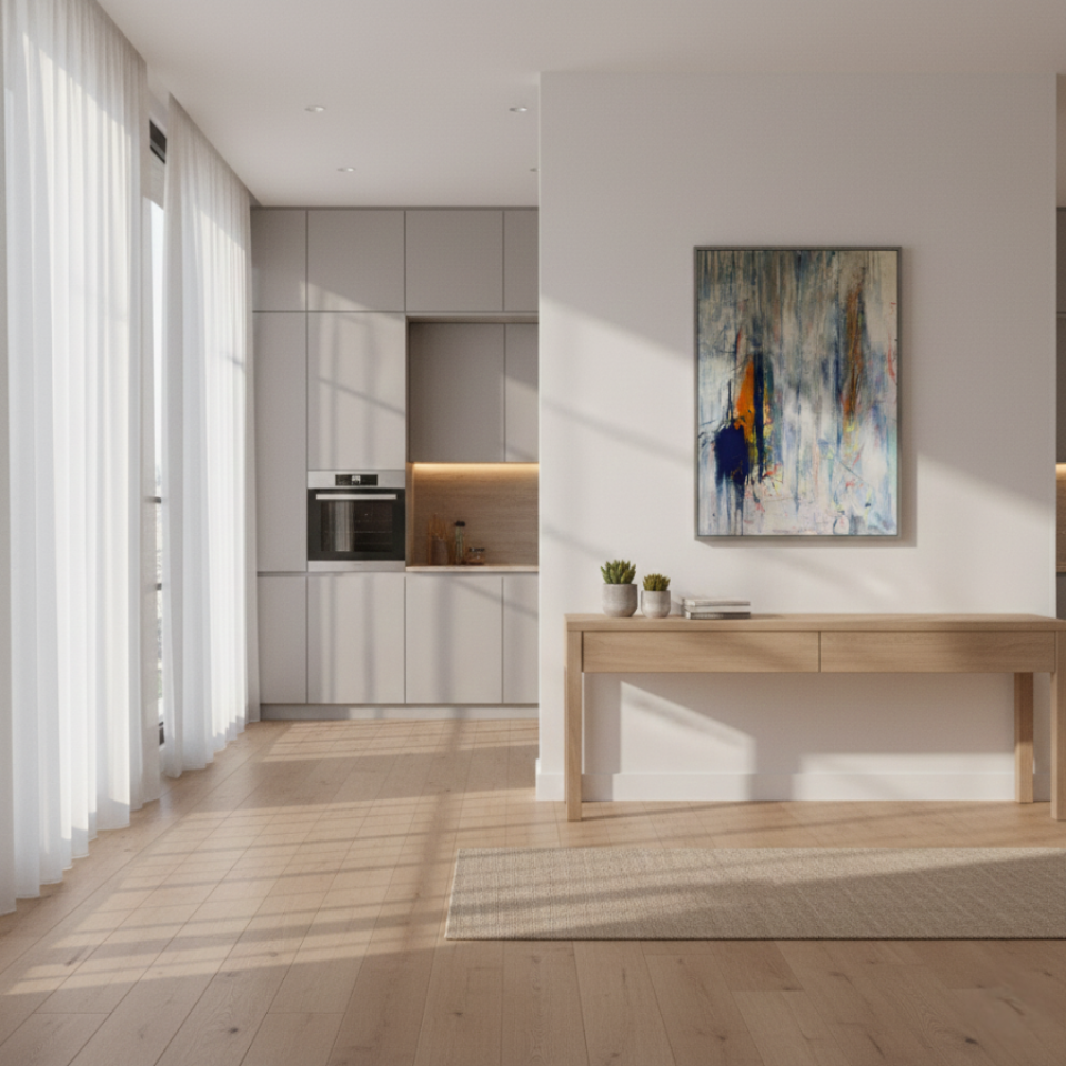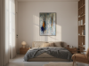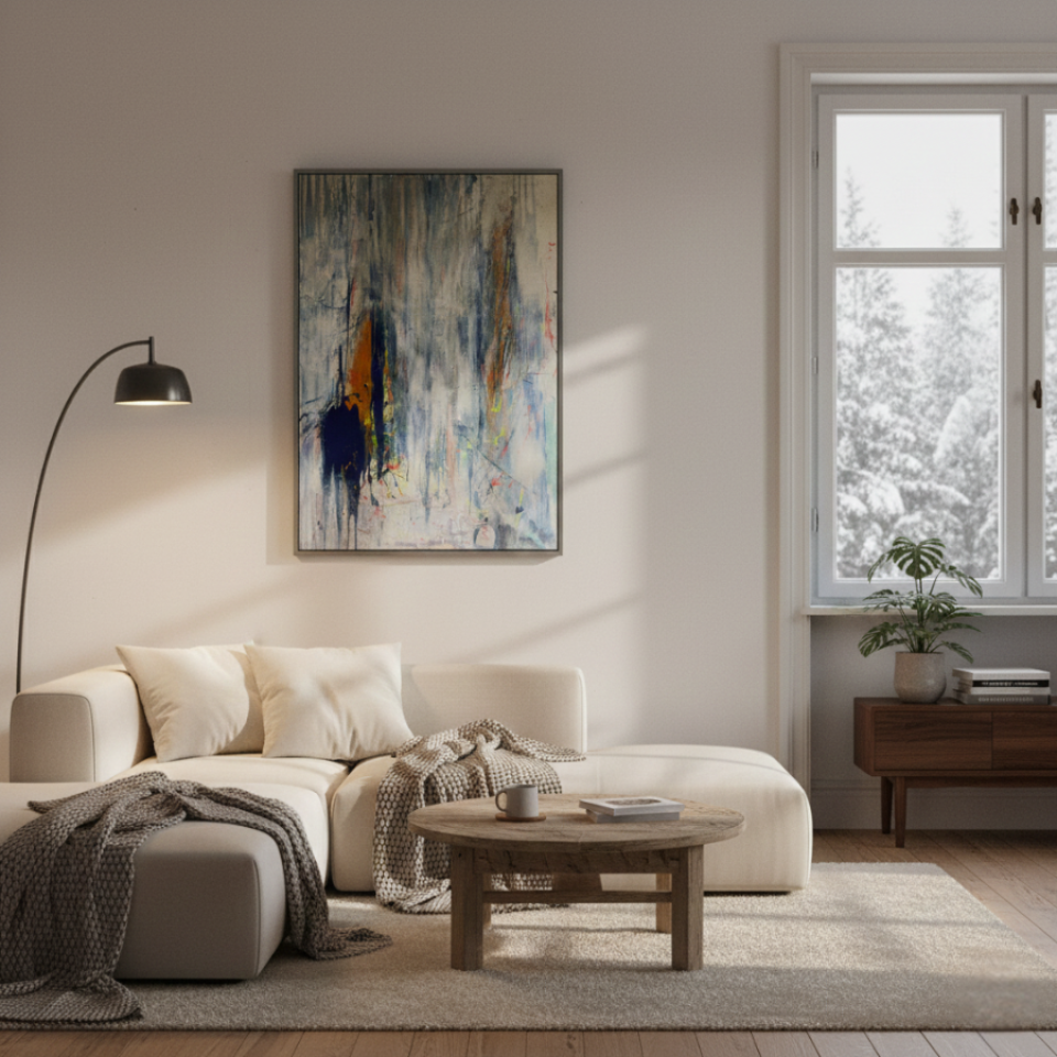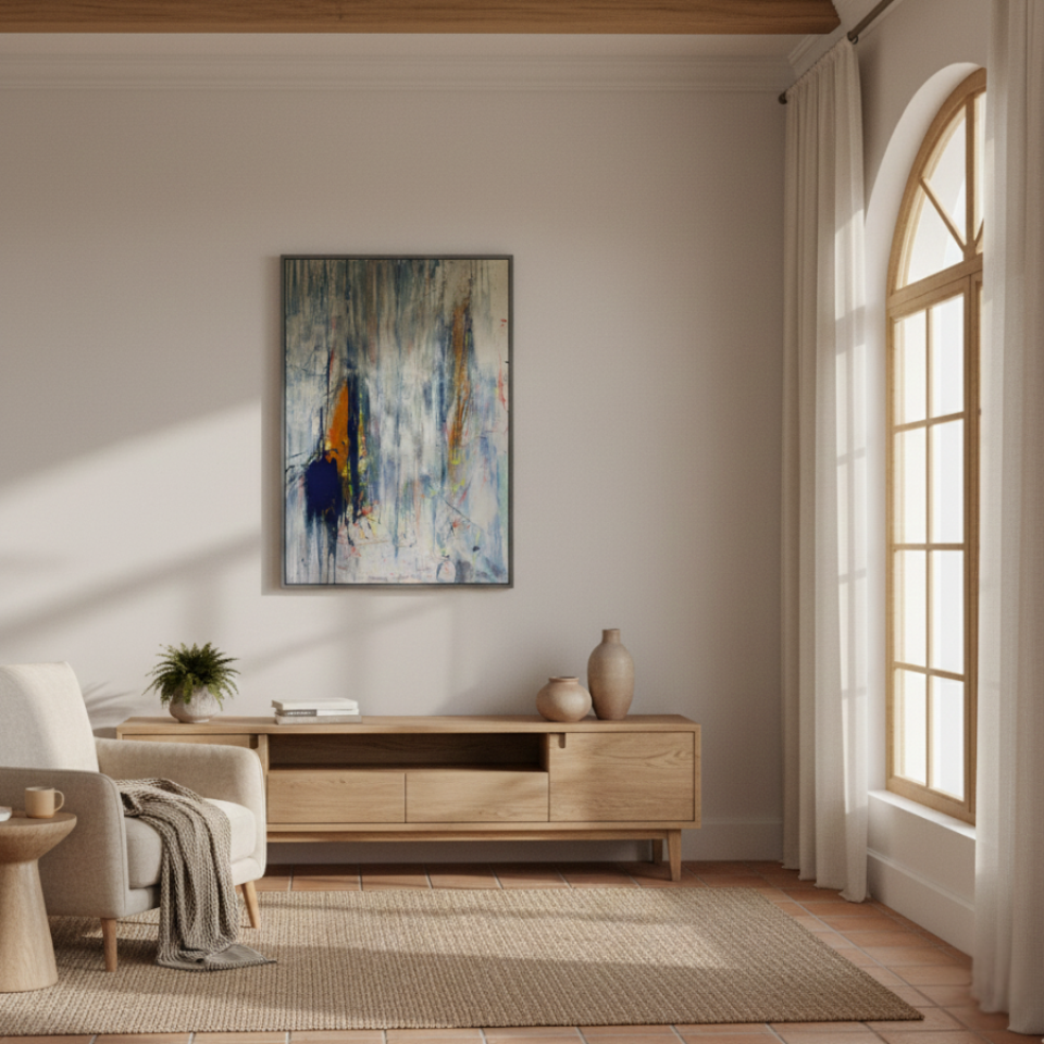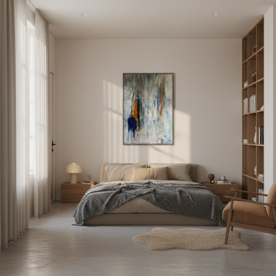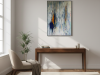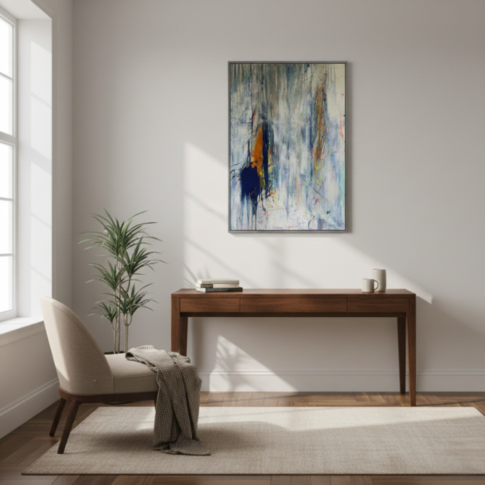 The first piece of the “Series Pastel”, “Frozen Sky”, sets the tone for the series with its cool, icy blues and soft grays, interrupted only by a single bold streak of bright yellow. The layering of paint creates an ethereal, cloud-like effect, as though the viewer is looking up at a sky on the verge of a winter storm. The painting conveys a feeling of quiet isolation, with the sharpness of the yellow acting as a reminder of warmth, distant but present. “Frozen Sky” invites the viewer to pause and reflect on the beauty found in cold, quiet spaces.