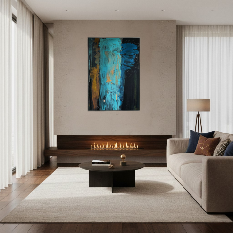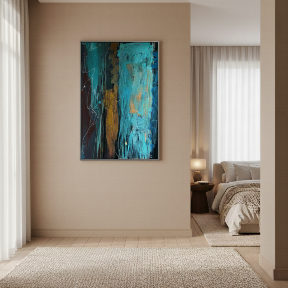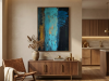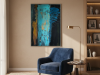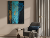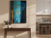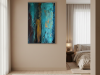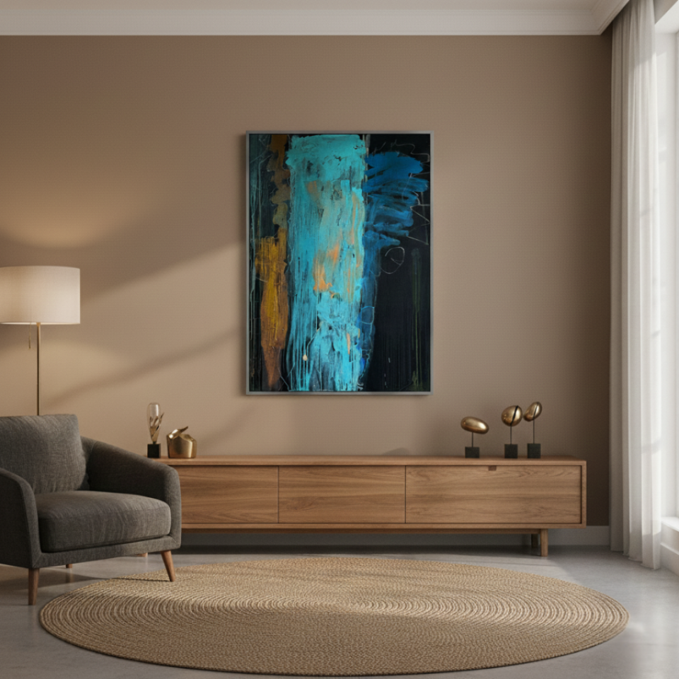 The first painting of the “Series Gold”, “Blue Velvet”, introduces the series with a deep and rich palette of blues, browns, and hints of gold. The abstract strokes of blue dominate the center, with textured layers dripping down the canvas, giving the piece a sense of depth and mystery. The velvety softness of the blue is contrasted by the harsher lines and streaks of brown and gold, creating a balance between smoothness and roughness. “Blue Velvet” evokes a sense of quiet strength, pulling the viewer into its depths with its lush, layered textures.