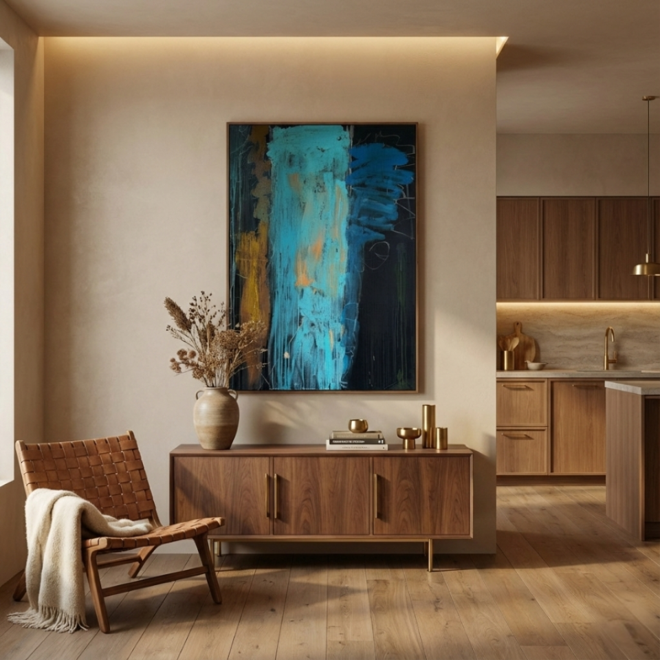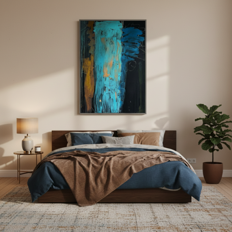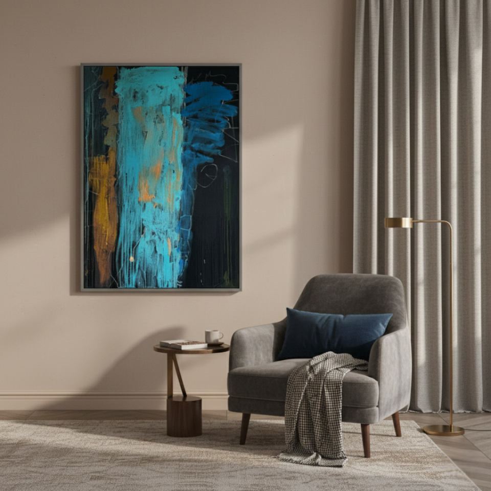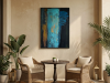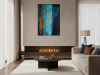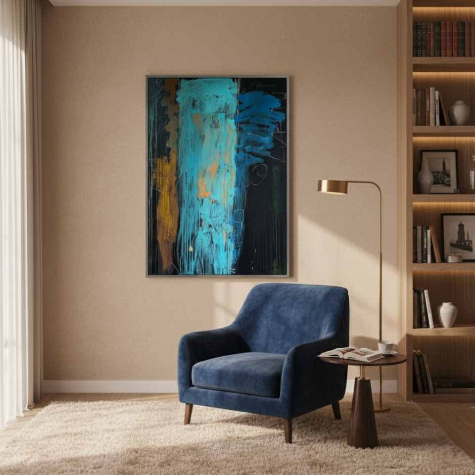 The first painting of the “Series Gold”, “Blue Velvet”, introduces the series with a deep and rich palette of blues, browns, and hints of gold. The abstract strokes of blue dominate the center, with textured layers dripping down the canvas, giving the piece a sense of depth and mystery. The velvety softness of the blue is contrasted by the harsher lines and streaks of brown and gold, creating a balance between smoothness and roughness. “Blue Velvet” evokes a sense of quiet strength, pulling the viewer into its depths with its lush, layered textures.