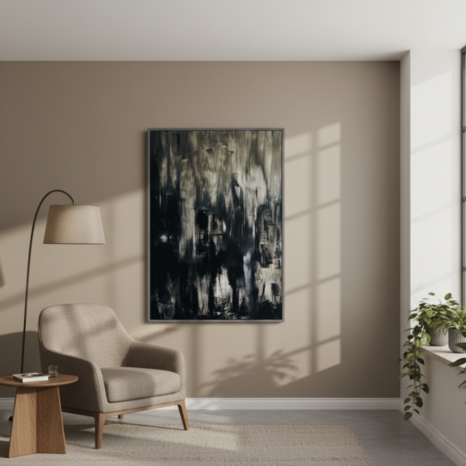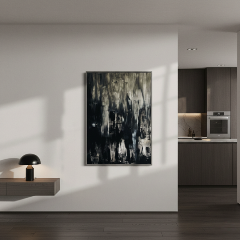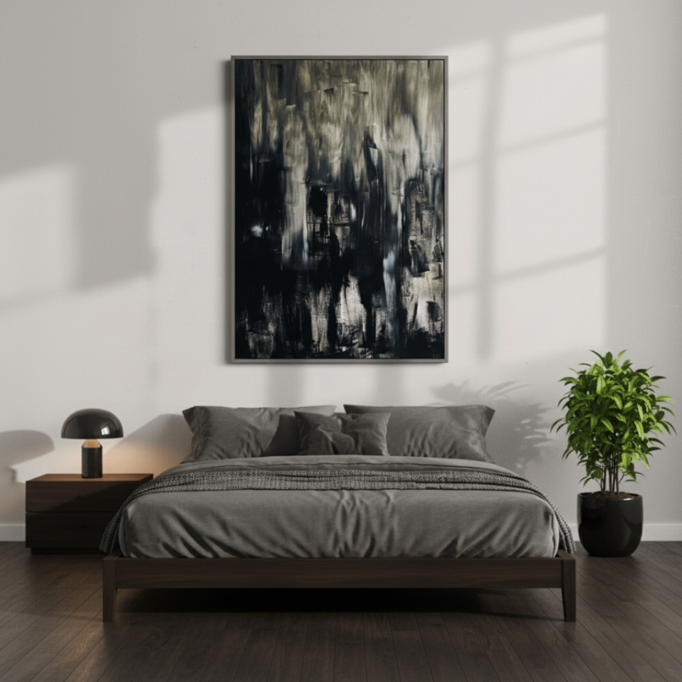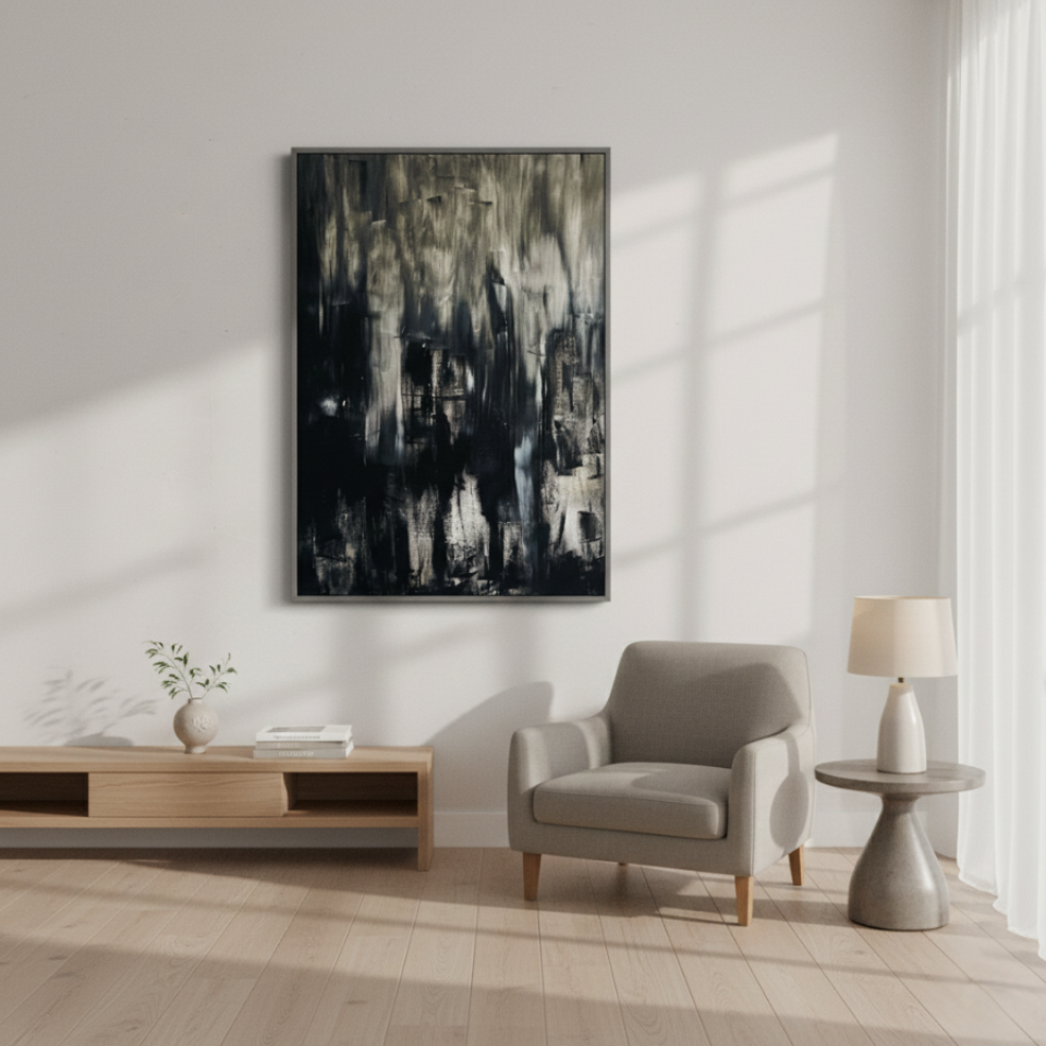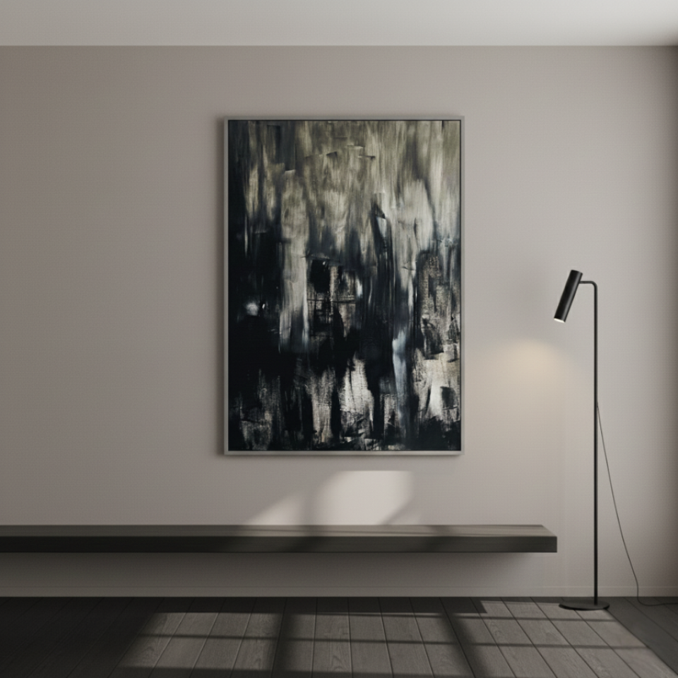 “Untitled Black 02” builds upon the themes introduced in the first painting, but with a more dynamic and textured approach. Here, the black is interspersed with streaks of gray and white, creating a more turbulent and layered effect. The rough brushstrokes and irregular patterns suggest movement, as though the shadows are shifting and morphing before our eyes. This painting evokes a sense of unrest, of something hidden beneath the surface struggling to emerge. “Untitled Black 02” challenges the viewer to confront the complexity of darkness, to see the beauty and chaos within the void.