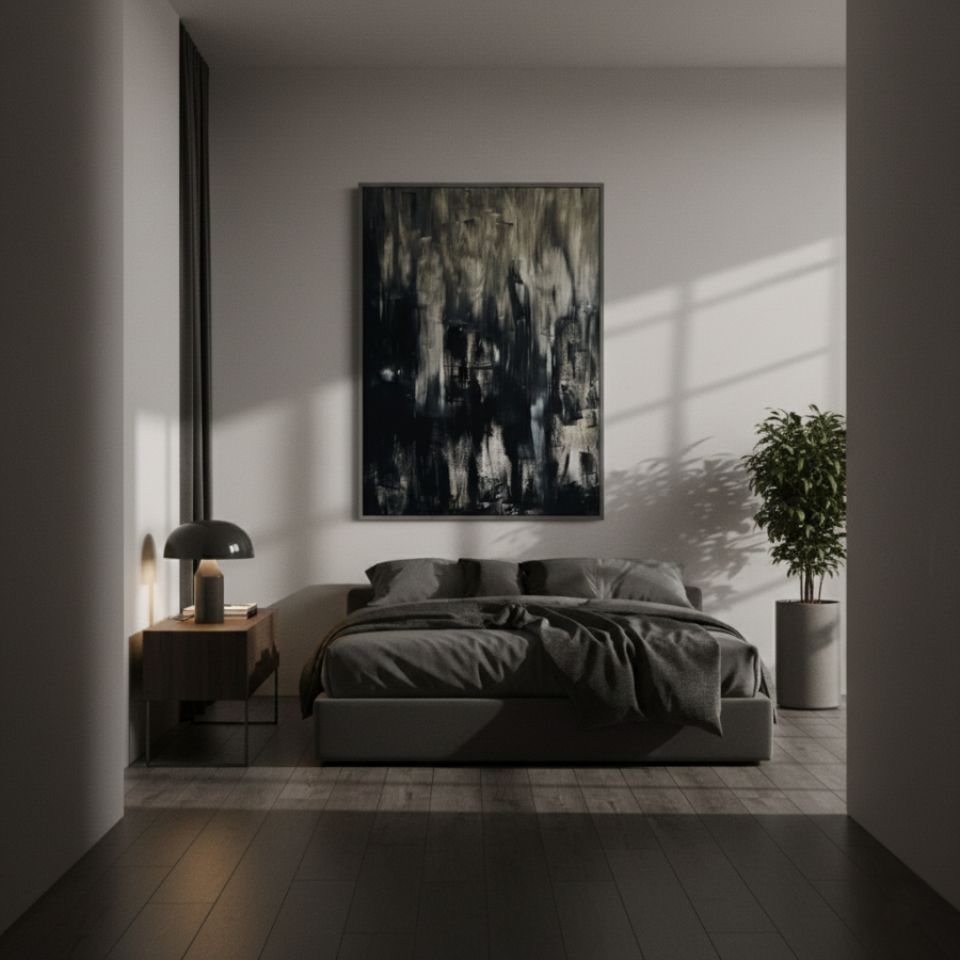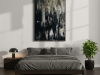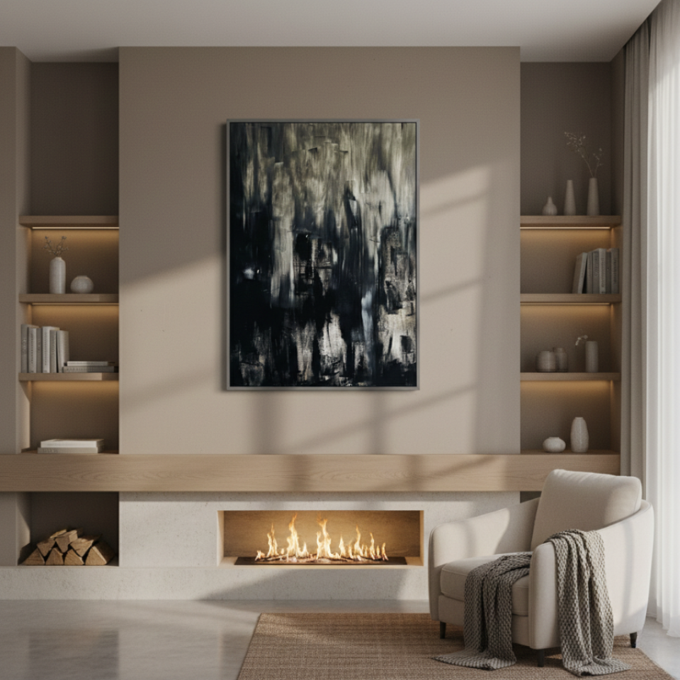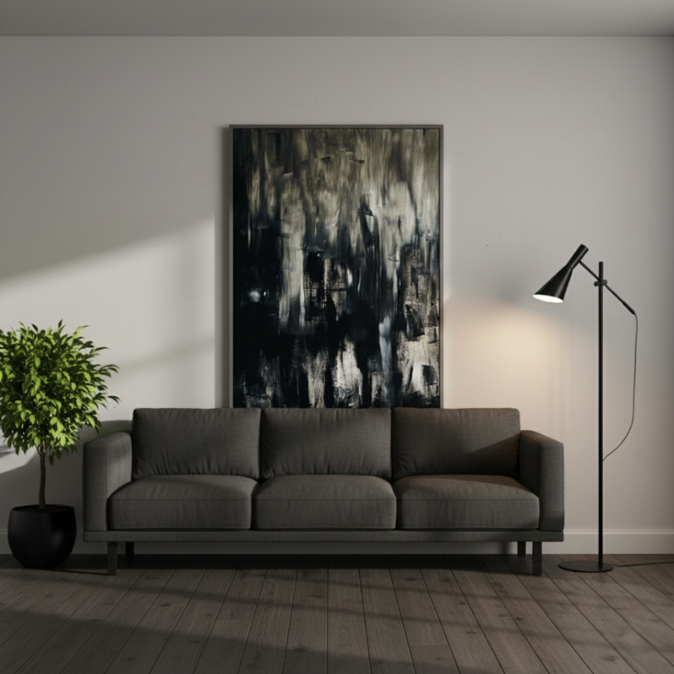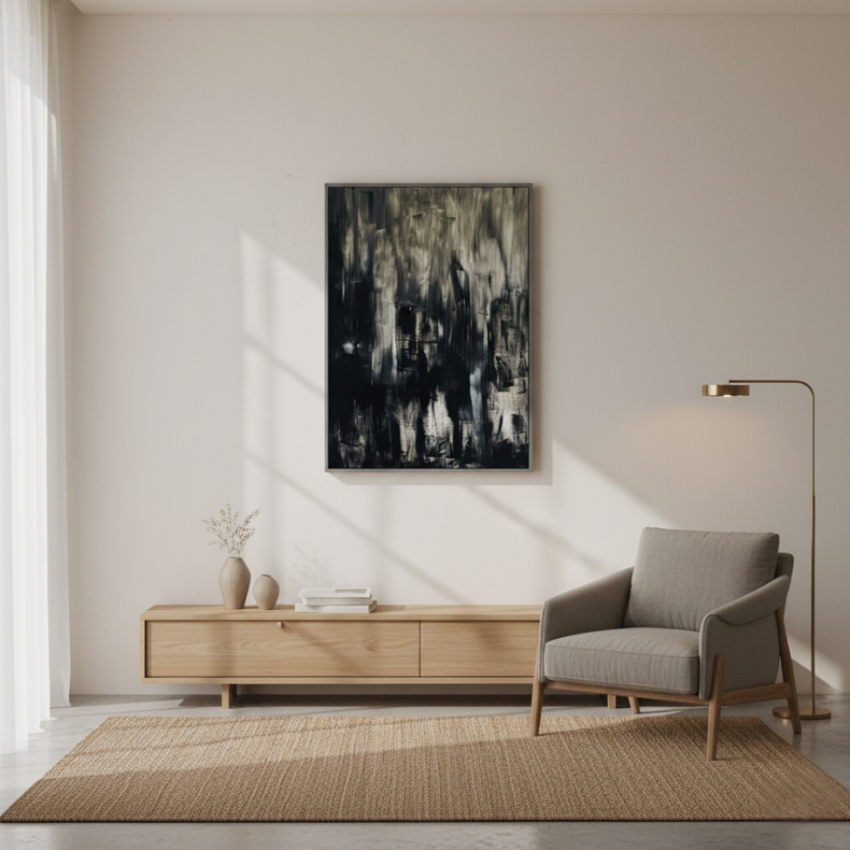 “Untitled Black 02” builds upon the themes introduced in the first painting, but with a more dynamic and textured approach. Here, the black is interspersed with streaks of gray and white, creating a more turbulent and layered effect. The rough brushstrokes and irregular patterns suggest movement, as though the shadows are shifting and morphing before our eyes. This painting evokes a sense of unrest, of something hidden beneath the surface struggling to emerge. “Untitled Black 02” challenges the viewer to confront the complexity of darkness, to see the beauty and chaos within the void.