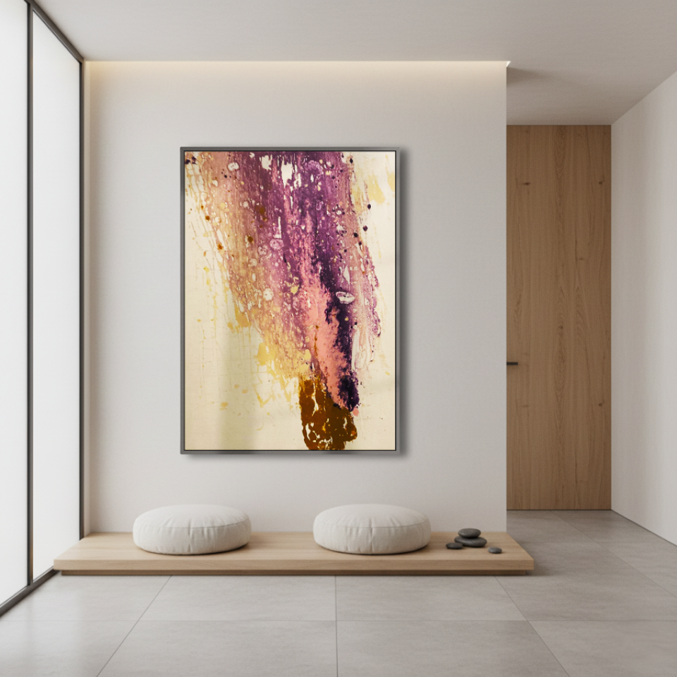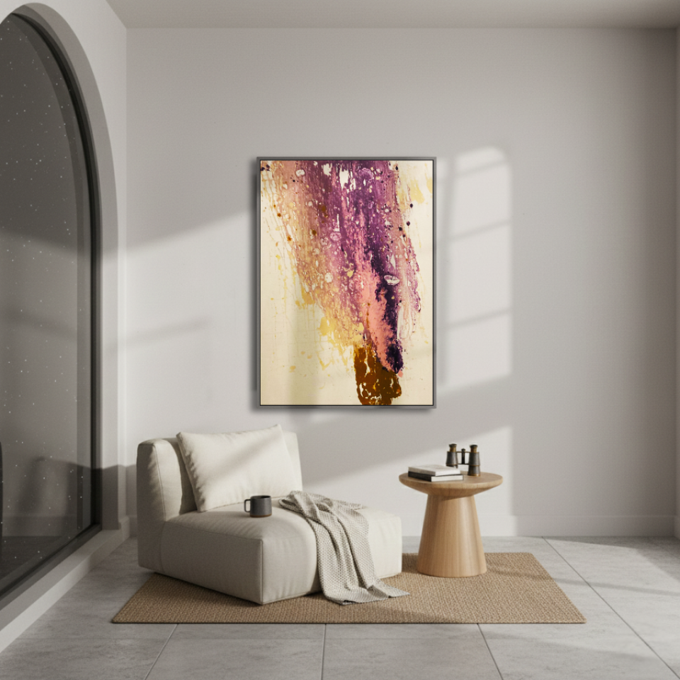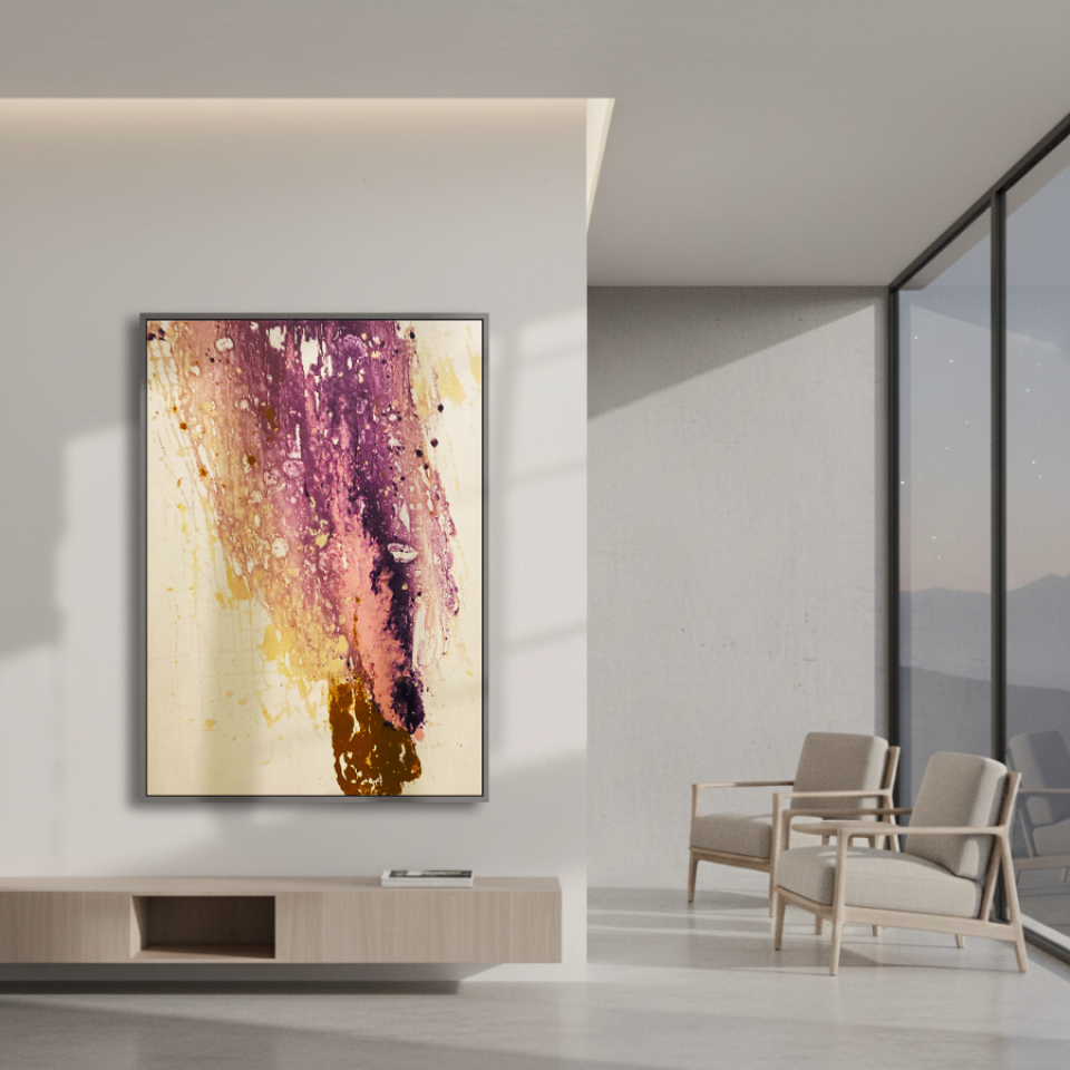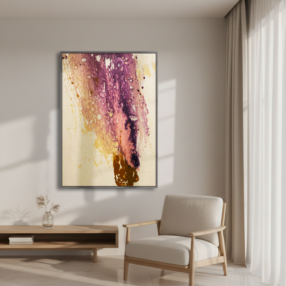 “Tricolore Astra” captures the ethereal beauty of the cosmos through an interplay of colors and textures. The painting features a sweeping cascade of deep purples, soft pinks, and warm ochres, evoking the vastness and mystery of a nebula. The composition flows gracefully, reminiscent of a stellar phenomenon in motion, with hints of light scattered across the canvas like distant stars. The delicate layering and dripping technique create a sense of fluidity and depth, drawing the viewer into an exploration of the unknown. This piece embodies the celestial, offering a glimpse into the boundless expanse of the universe, where matter and energy intertwine in a cosmic dance.