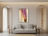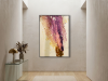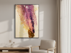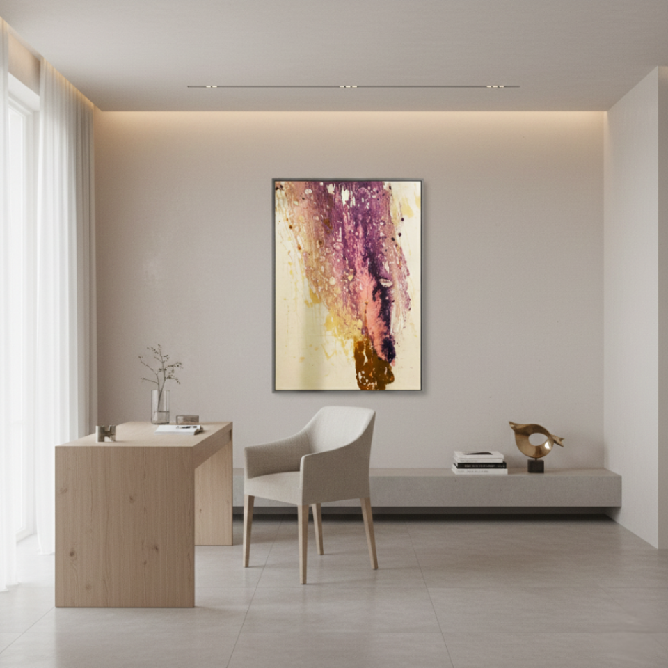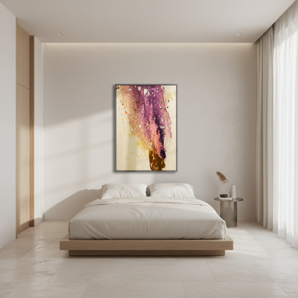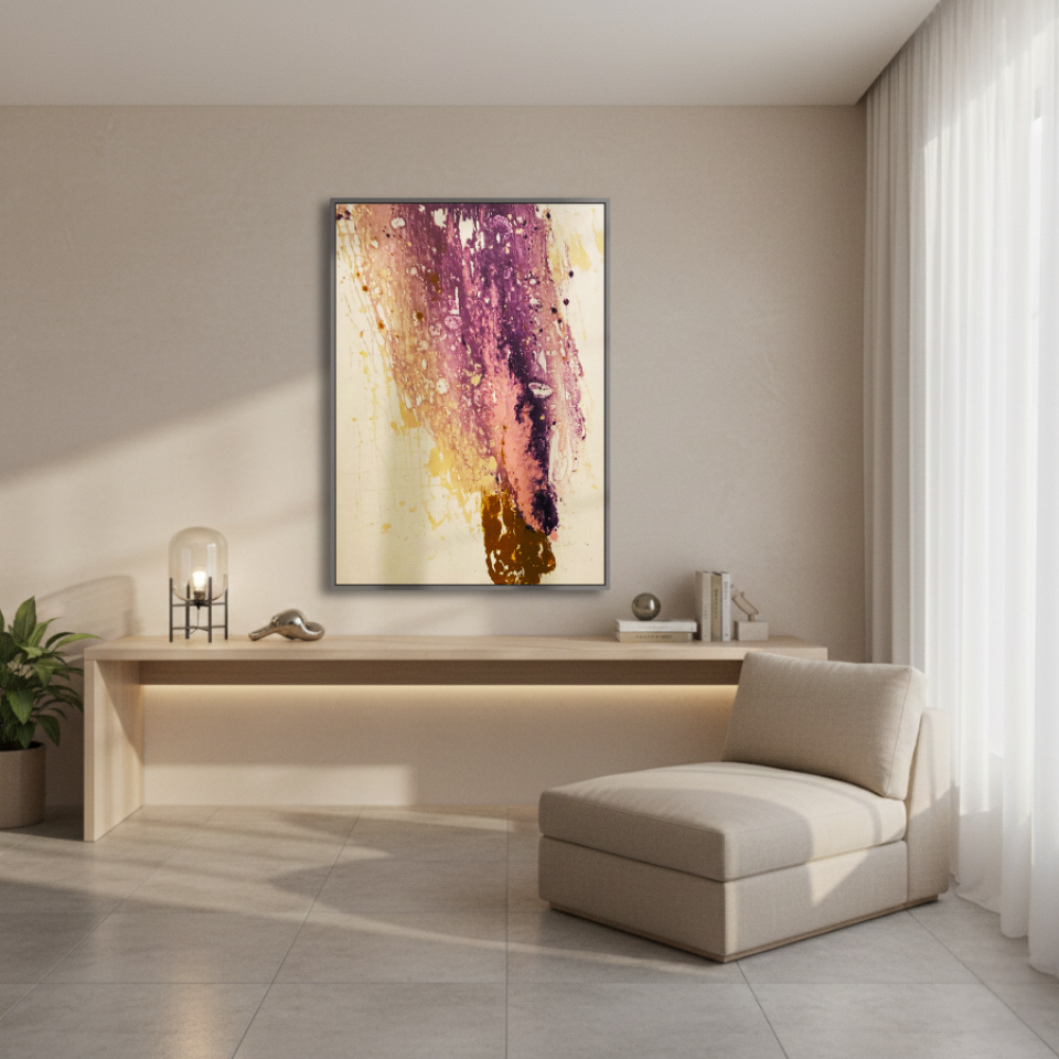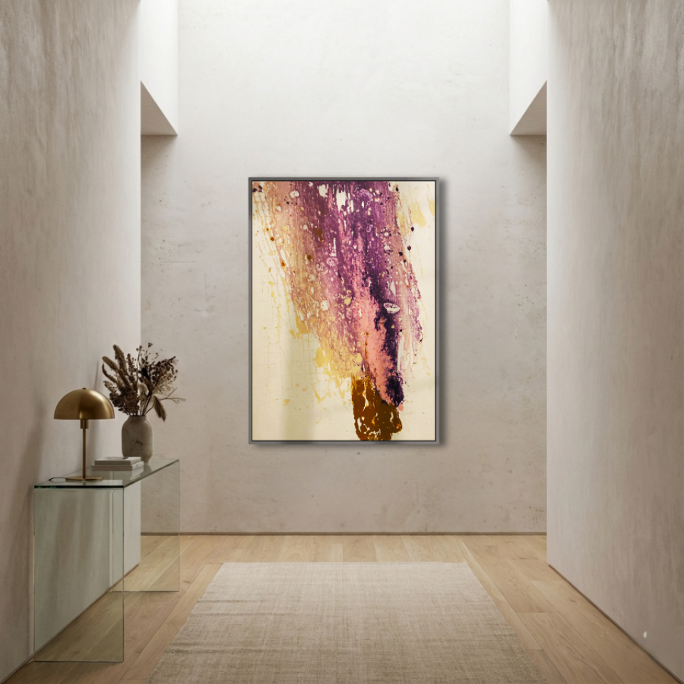 “Tricolore Astra” captures the ethereal beauty of the cosmos through an interplay of colors and textures. The painting features a sweeping cascade of deep purples, soft pinks, and warm ochres, evoking the vastness and mystery of a nebula. The composition flows gracefully, reminiscent of a stellar phenomenon in motion, with hints of light scattered across the canvas like distant stars. The delicate layering and dripping technique create a sense of fluidity and depth, drawing the viewer into an exploration of the unknown. This piece embodies the celestial, offering a glimpse into the boundless expanse of the universe, where matter and energy intertwine in a cosmic dance.