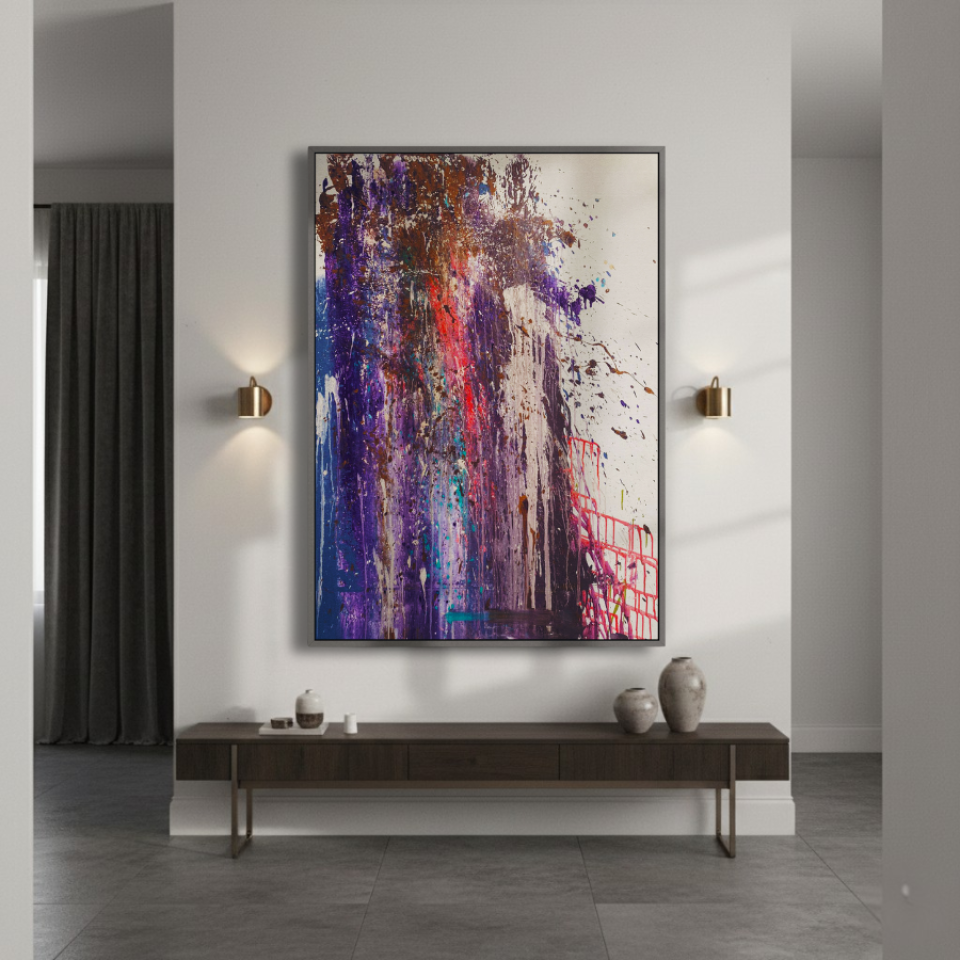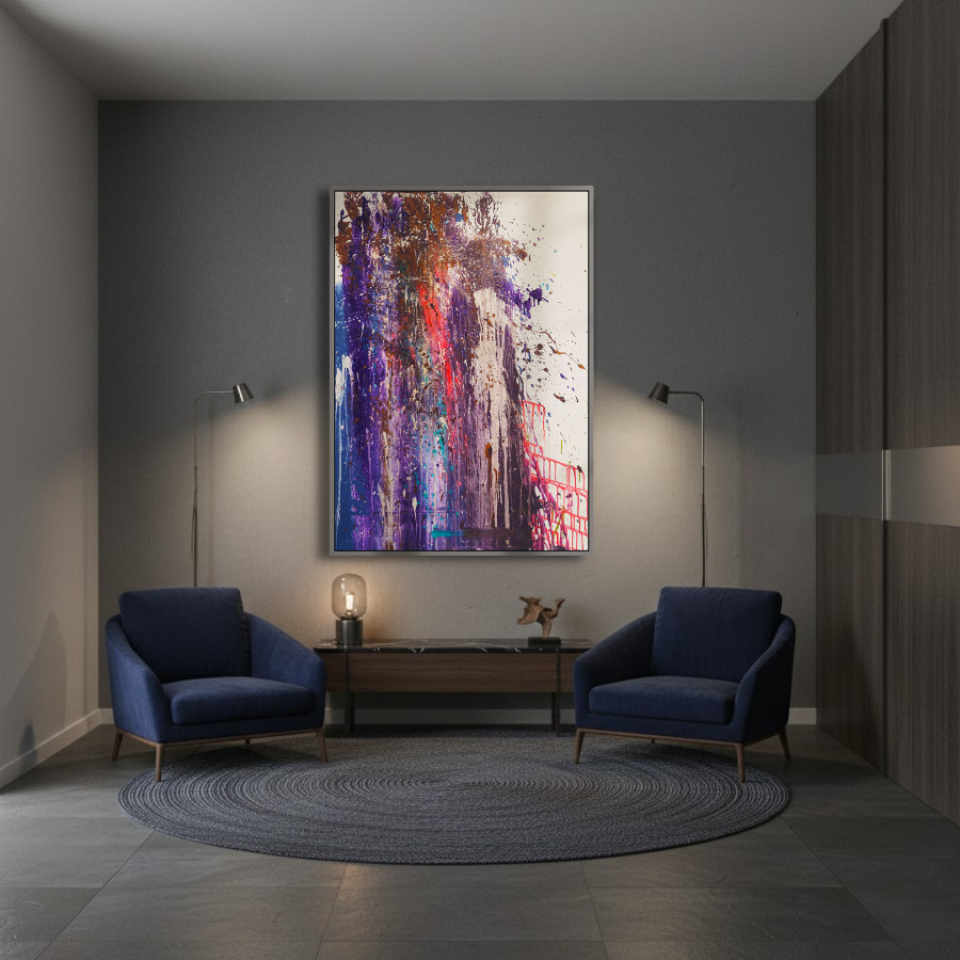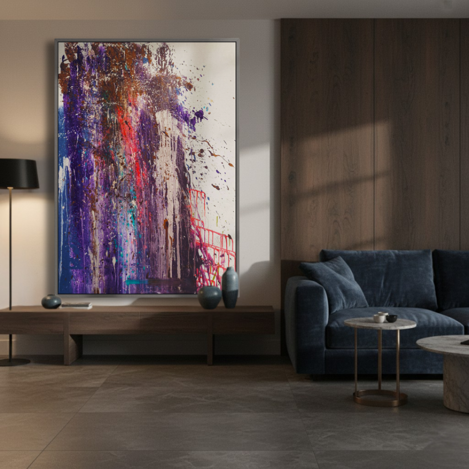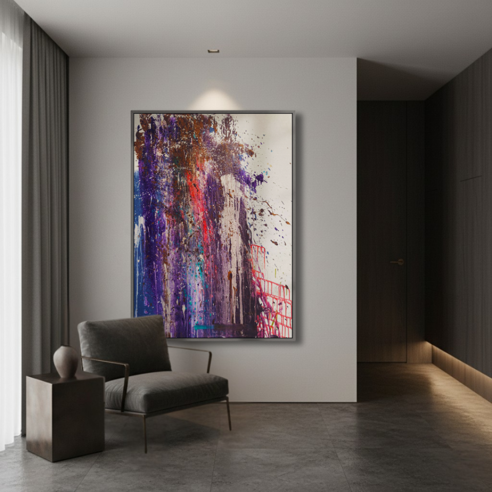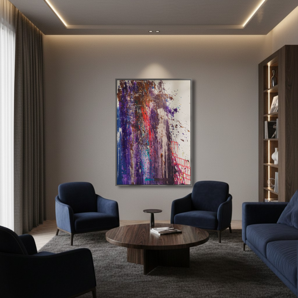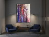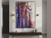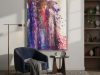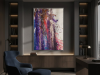 The middle painting of the Series Velvet, “Eclipse,” embodies the enigmatic and fleeting nature of a moment where light and shadow converge. The dominant hues of deep purples and blues are interspersed with bold streaks of red, suggesting a celestial event that captures the eye and the imagination. There’s a sense of movement within the layers, as if the colors are swirling and coalescing into a transient alignment. The texture is dynamic, with splatters and drips that evoke a sense of energy and tension, much like the cosmic forces at play during an eclipse. The interplay of light and darkness within the composition hints at the delicate balance between revelation and obscurity, capturing a moment that is both transformative and elusive. “Eclipse” invites the viewer to pause and witness the beauty that emerges in the intersection of contrasts.