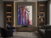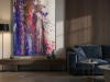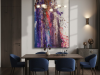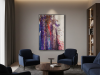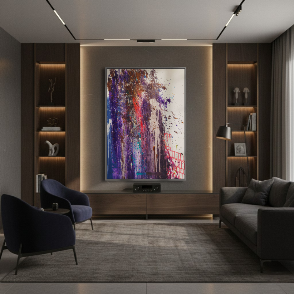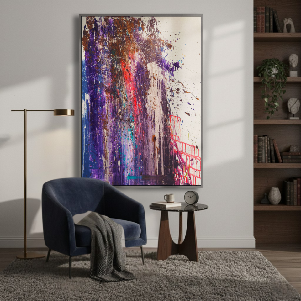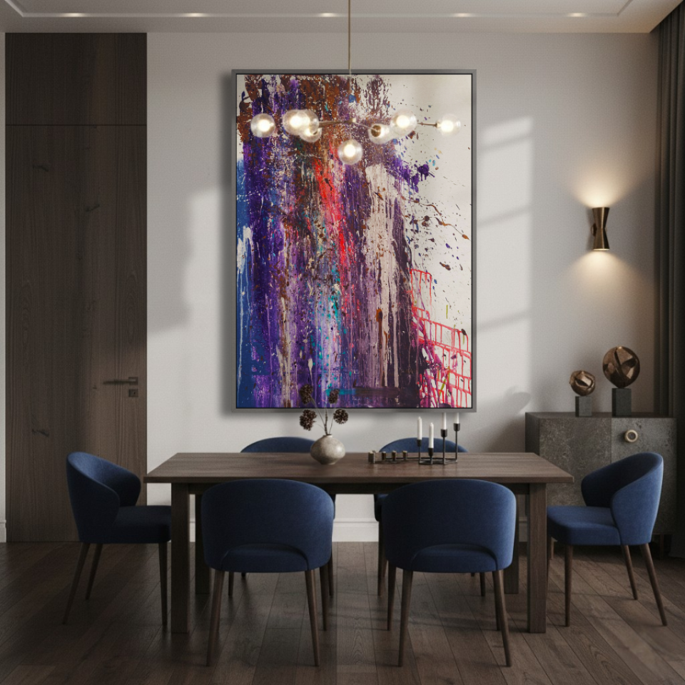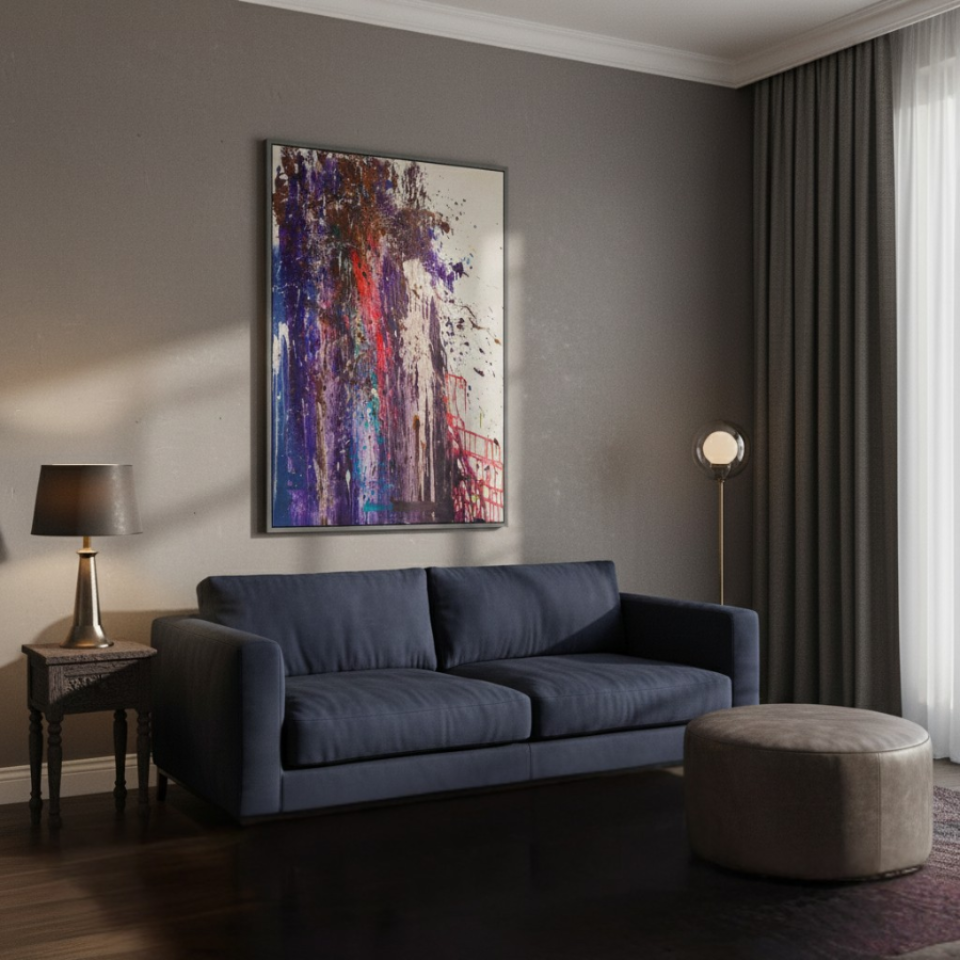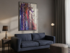 The middle painting of the Series Velvet, “Eclipse,” embodies the enigmatic and fleeting nature of a moment where light and shadow converge. The dominant hues of deep purples and blues are interspersed with bold streaks of red, suggesting a celestial event that captures the eye and the imagination. There’s a sense of movement within the layers, as if the colors are swirling and coalescing into a transient alignment. The texture is dynamic, with splatters and drips that evoke a sense of energy and tension, much like the cosmic forces at play during an eclipse. The interplay of light and darkness within the composition hints at the delicate balance between revelation and obscurity, capturing a moment that is both transformative and elusive. “Eclipse” invites the viewer to pause and witness the beauty that emerges in the intersection of contrasts.