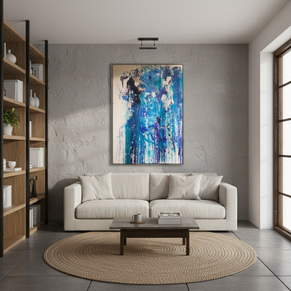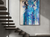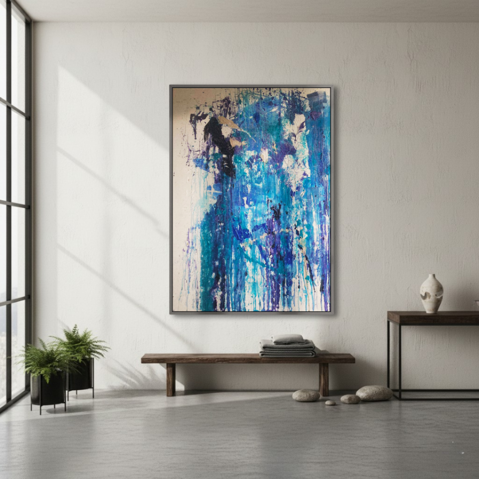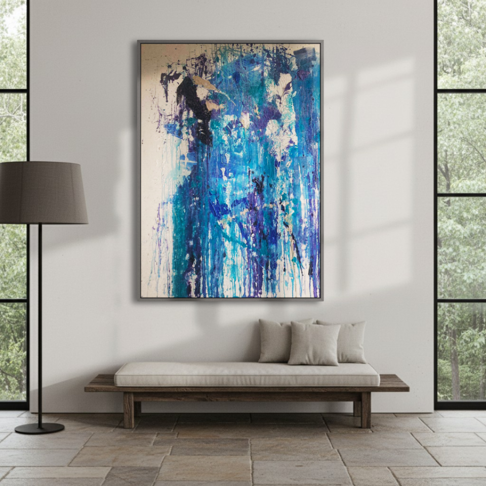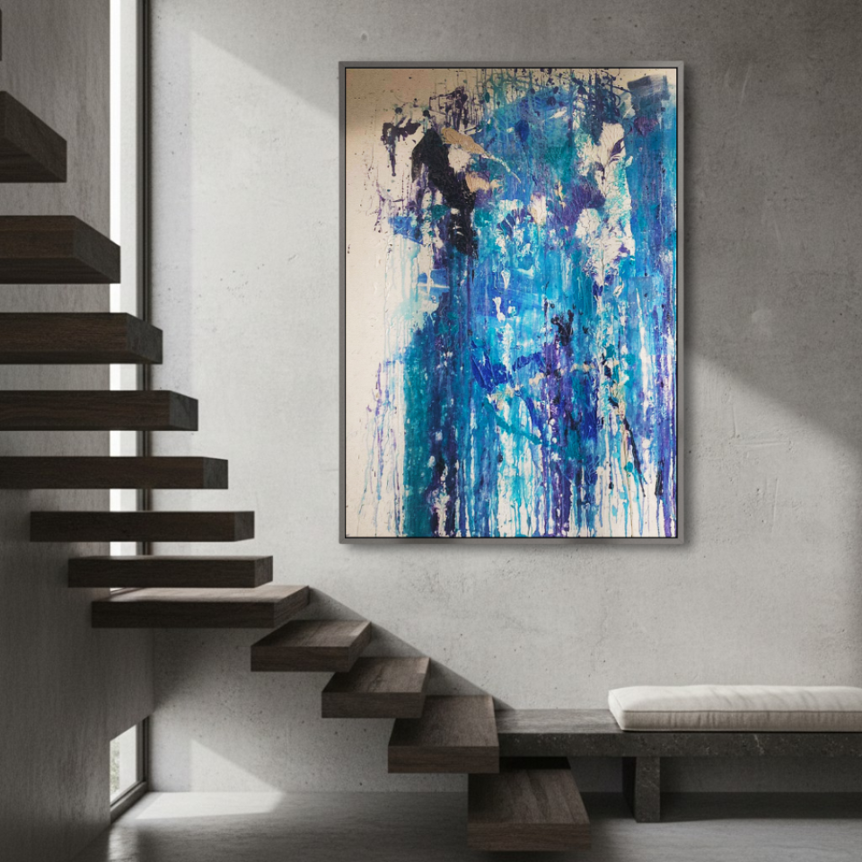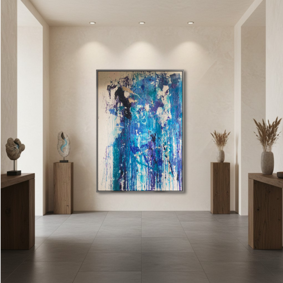 The first painting of the “Series Aquamarine”, “Cascade,” embodies the powerful and fluid energy of a waterfall in motion. Dominated by vibrant shades of blue, interspersed with hints of white and darker tones, the piece captures the essence of water flowing with unrestrained force. The paint drips and splatters down the canvas, mimicking the natural descent of water as it cascades over rocks and cliffs. The textures and layers create a sense of depth, drawing the viewer into the painting as if they are standing at the edge of a rushing stream. “Cascade” is a celebration of nature’s relentless and awe-inspiring power, a reminder of the beauty and intensity found in the simplest of elements.