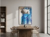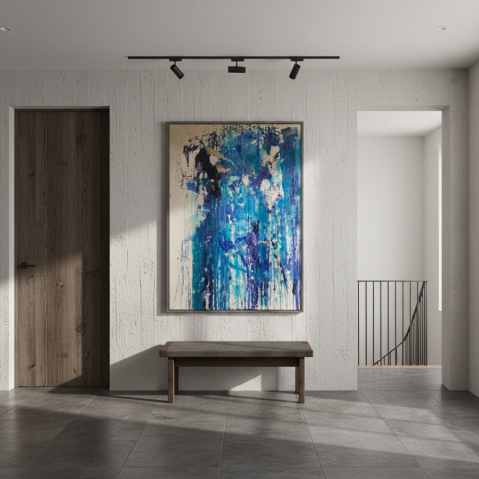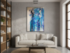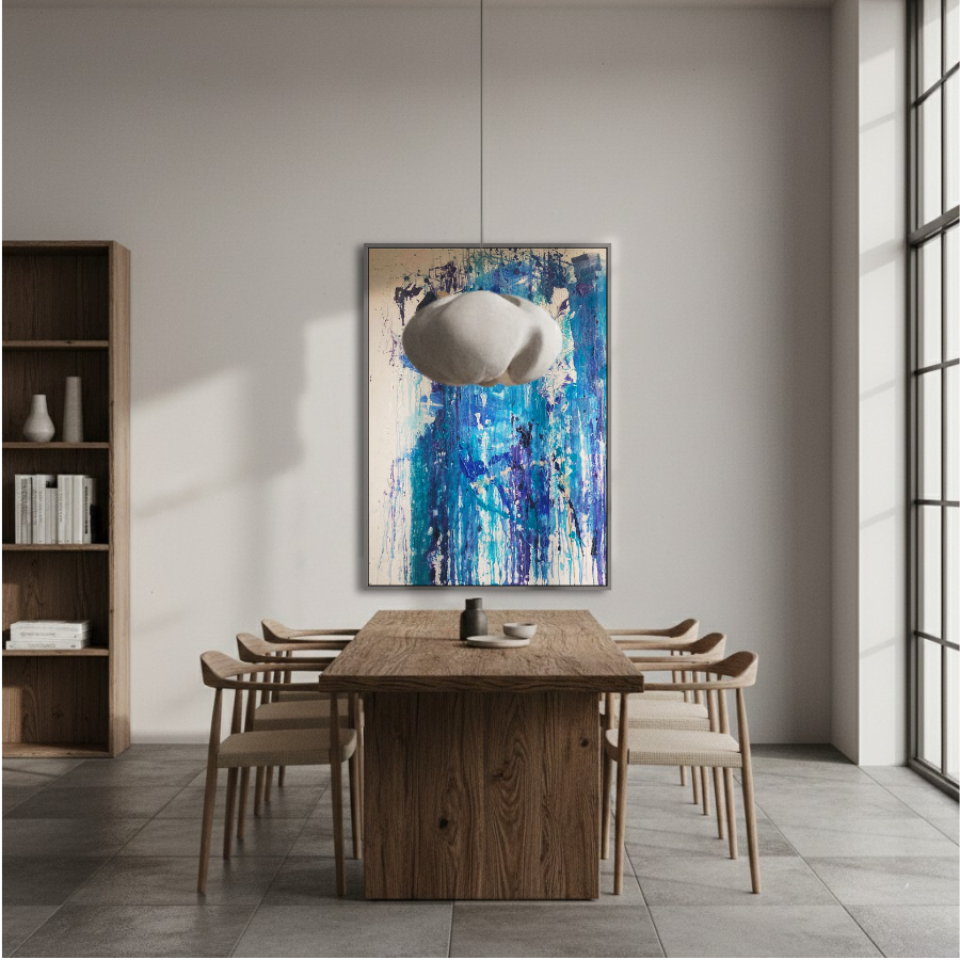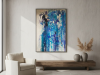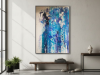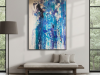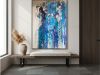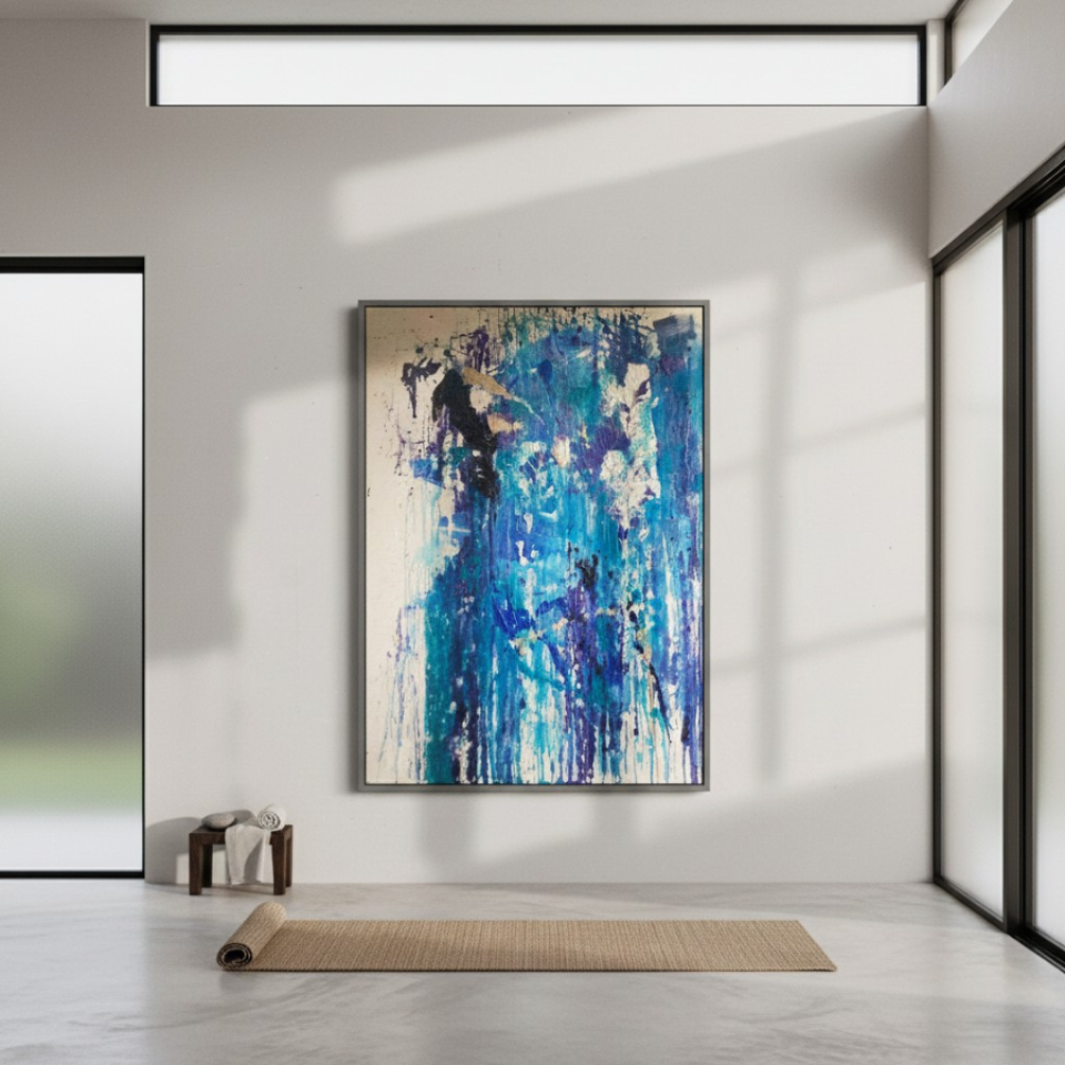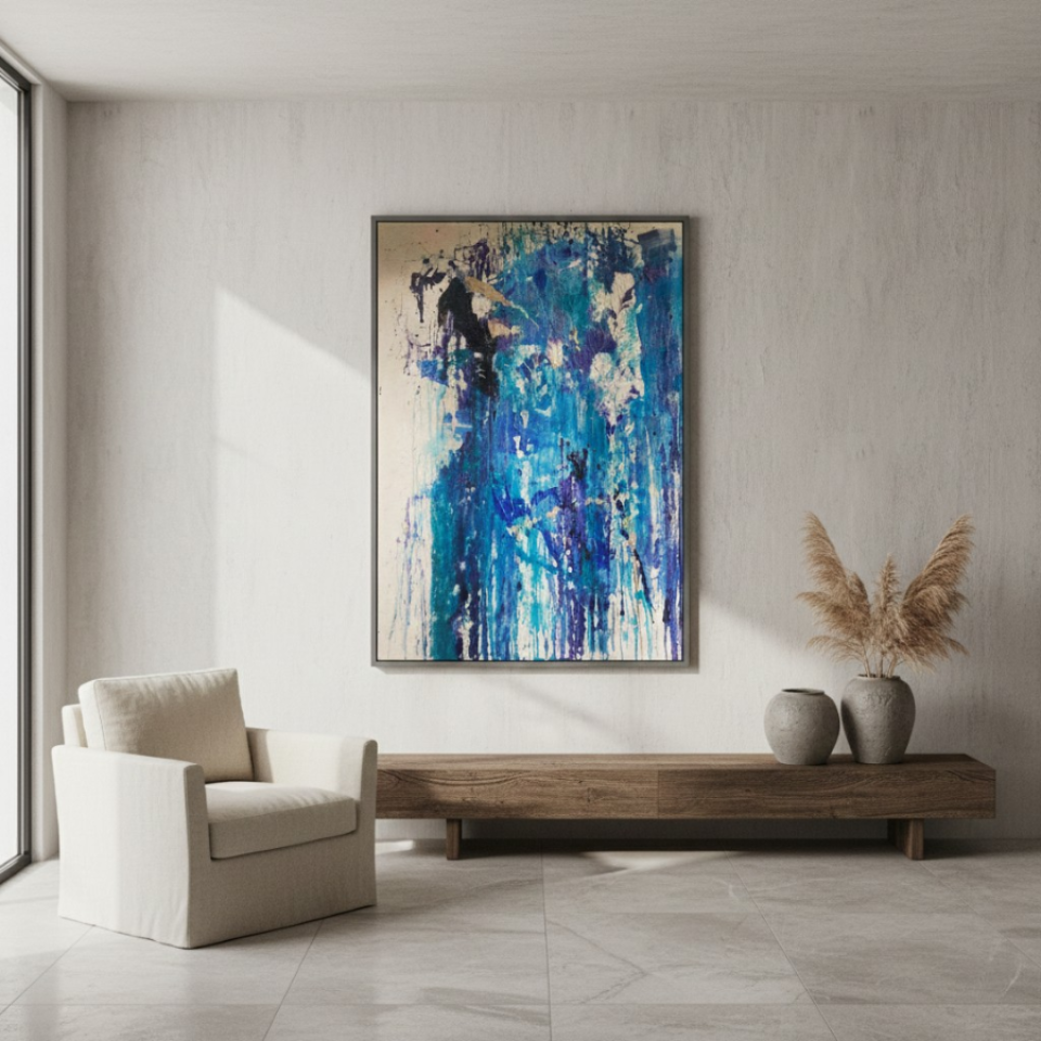 The first painting of the “Series Aquamarine”, “Cascade,” embodies the powerful and fluid energy of a waterfall in motion. Dominated by vibrant shades of blue, interspersed with hints of white and darker tones, the piece captures the essence of water flowing with unrestrained force. The paint drips and splatters down the canvas, mimicking the natural descent of water as it cascades over rocks and cliffs. The textures and layers create a sense of depth, drawing the viewer into the painting as if they are standing at the edge of a rushing stream. “Cascade” is a celebration of nature’s relentless and awe-inspiring power, a reminder of the beauty and intensity found in the simplest of elements.