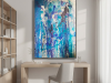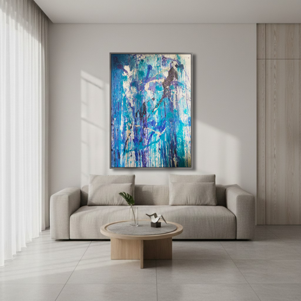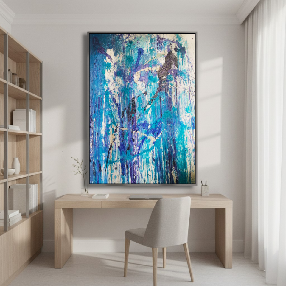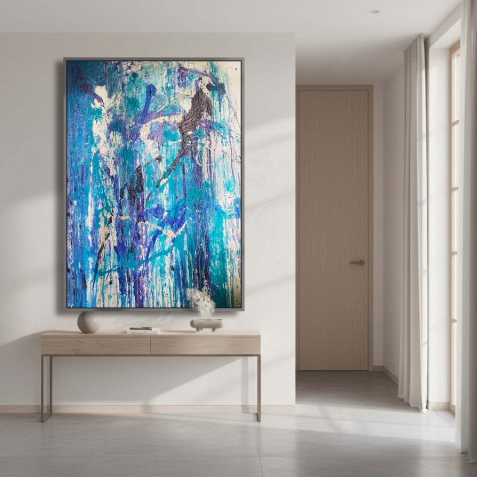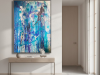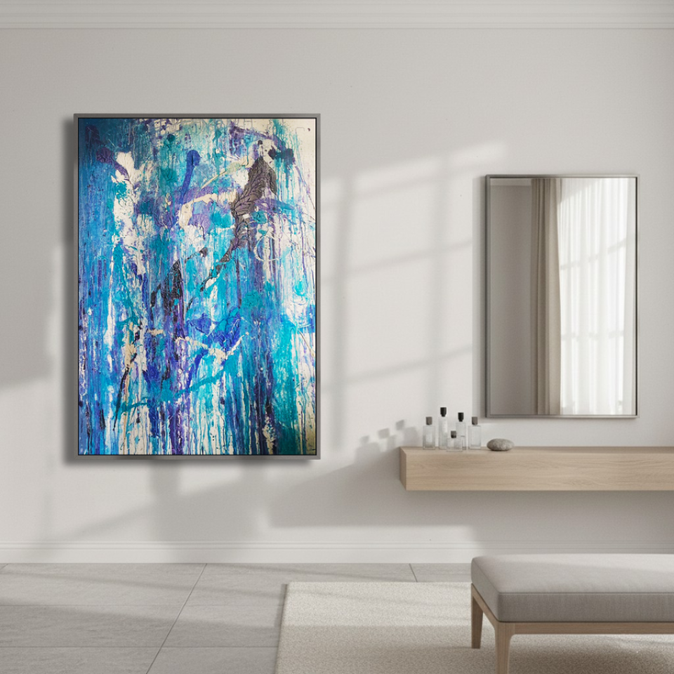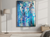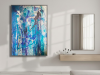 The final piece of the “Series Aquamarine”, “Reflections,” invites the viewer into a more introspective and tranquil exploration of the interplay between light and water. Layers of soft blues and whites blend seamlessly together, creating an abstract representation of water’s surface as it mirrors the world around it. Subtle variations in tone and texture give the impression of light dancing across the water, casting shadows and creating intricate patterns. The composition is both calming and complex, with areas of clarity and obscurity that draw the eye deeper into the painting. “Reflections” is a meditation on the ephemeral nature of water and light, capturing the quiet beauty found in the ever-changing play of reflections.