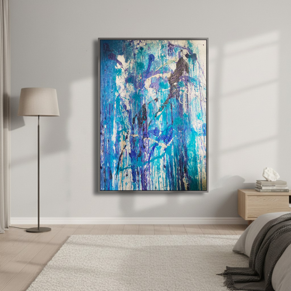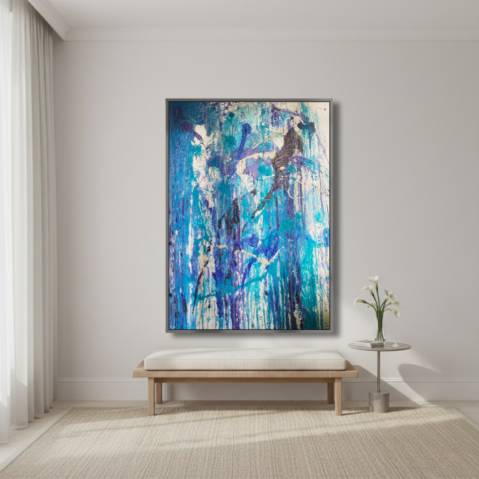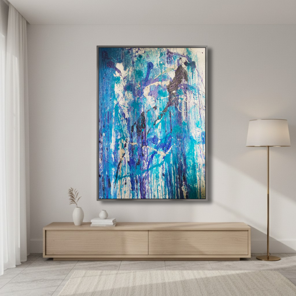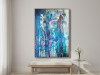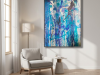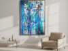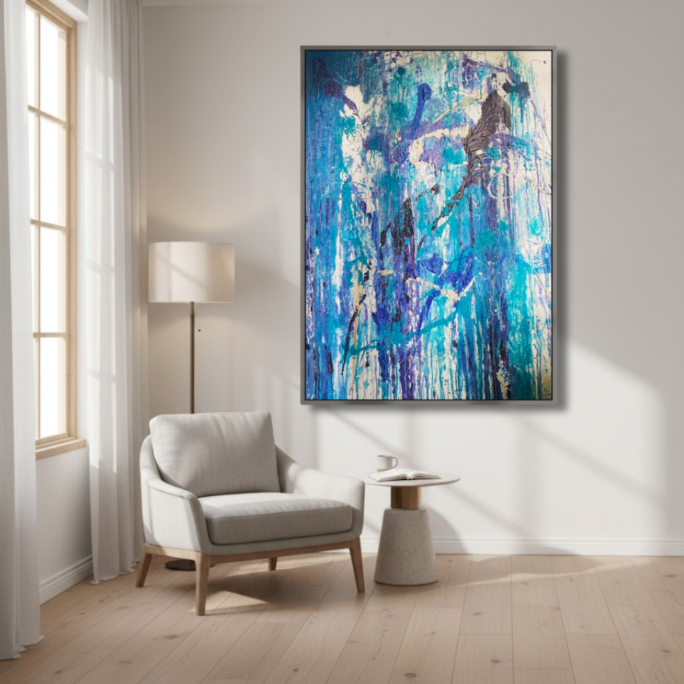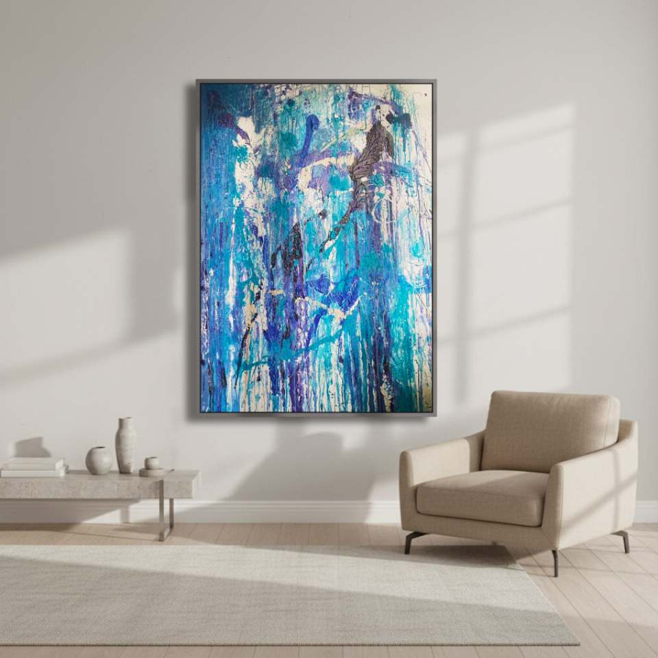 The final piece of the “Series Aquamarine”, “Reflections,” invites the viewer into a more introspective and tranquil exploration of the interplay between light and water. Layers of soft blues and whites blend seamlessly together, creating an abstract representation of water’s surface as it mirrors the world around it. Subtle variations in tone and texture give the impression of light dancing across the water, casting shadows and creating intricate patterns. The composition is both calming and complex, with areas of clarity and obscurity that draw the eye deeper into the painting. “Reflections” is a meditation on the ephemeral nature of water and light, capturing the quiet beauty found in the ever-changing play of reflections.